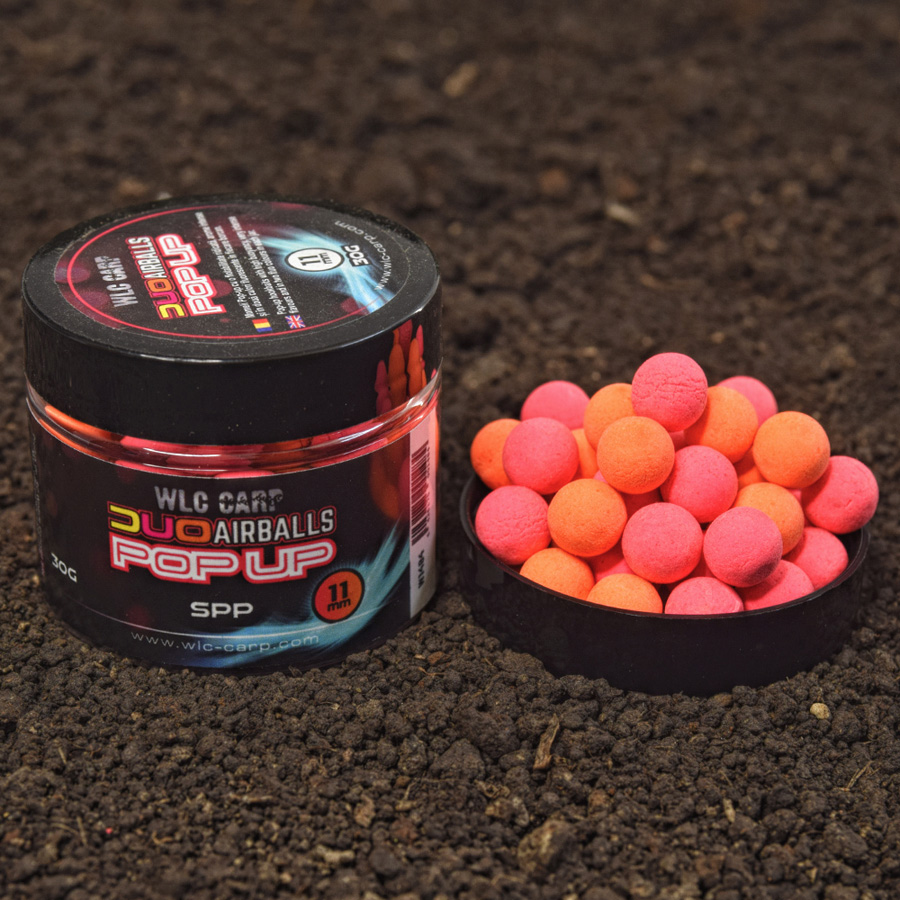 Momelile Pop-up Duo Airballs SPP 11mm au la baza un mix imbunatatit, extrem de flotant realizat 100% de catre echipa WLC Carp iar cele doua culori Portocaliu Fluo si Roz Fluo din borcan ofera doua optiuni cu o vizibilitate crescuta in orice tip de apa.